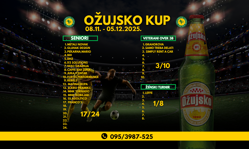 Ožujsko kup održat će se od 08.11. do 05.12.2025. na terenima Nogometnog centra Šalata a igrat će se u 3 kategorije: SENIORI, VETERANI OVER 38 i ŽENSKI TURNIR.